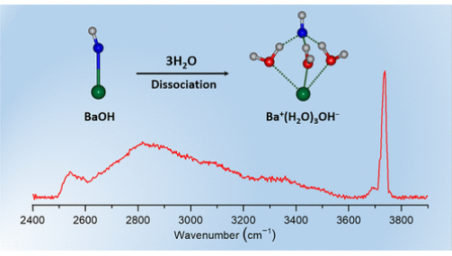 Abstract: Investigating the dissociation of base in a microhydration environment is important for revealing various fundamental physical and chemical processes. In this study, neutral open-shell BaOH(H2O)n (n = 1–5) clusters were characterized by size-specific infrared-vacuum ultraviolet photoionization spectroscopy combined with quantum chemical calculations and ab initio molecular dynamics simulations. The results show that the Ba–OH bond is undissociated for n = 1 and 2, and the transition from contact ion pair (CIP) to solvent-shared ion pair (SIP) spontaneously starts at n = 3. The present findings clarify the previous debate that BaOH shows no sign of dissociation even at n = 5. This work reveals the microscopic mechanisms of base dissolution processes and lays a solid foundation for broader application across systems.