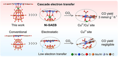 Abstract: The POM@MOF system, integrating the exceptional properties of polyoxometalates (POM) and metal-organic frameworks (MOF), exhibits considerable catalytic potential. However, the absence of stable and well-defined electron-transfer pathways between the two components hampers charge separation and transport, thereby limiting its catalytic efficiency. Here, we constructed a Ni single-atom electronic bridge (SAEB) between POM and MOF, based on our previously-reported PMo11W@rht-MOF-1 composite. Spherical aberration-corrected transmission electron microscopy and X-ray absorption spectroscopy analyses revealed not only the hierarchical dispersion of single-atom Ni, POM, and MOF, but also the formation of chemical bonds between Ni and both POM and MOF. This precisely engineered Ni-SAEB facilitated cascade electron transfer from the encapsulated PMo11W to rht-MOF-1 framework, as confirmed by femtosecond transient absorption spectroscopy and in situ X-ray photoelectron spectroscopy. Further investigations demonstrated that the Ni-SAEB/POM@MOF system simultaneously harnessed the “electronic sponge” effect of POM and the CO2 adsorption-conversion capability of MOF. Consequently, the Ni-SAEB/PMo11W@rht-MOF-1 composite achieved a CO2-to-CO photocatalytic conversion rate of 3 mmol g1 h1, markedly surpassing that of PMo11W@rht-MOF-1 without Ni-SAEB. This work establishes the SAEB strategy as a versatile catalytic concept, where single atoms serve as both surface catalytic centers and interfacial cascade electron mediators, with broad scientific significance.