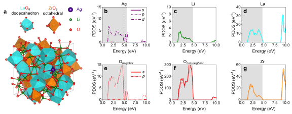 第一性原理计算表明,在实际材料表面存在微量氧的条件下,银与锂之间的离子交换在退火过程中具有良好的热力学可行性,并伴随形成稳定的锂氧化物,这一结果得到实验观测的验证。进一步分析显示,银离子优先占据LLZO中原本由锂离子占据的位置,但几乎不改变材料的整体电子结构和带隙特性(图2)。尽管在银原子局部会引入少量局域电子态,但并不会形成连续的电子传导通道。