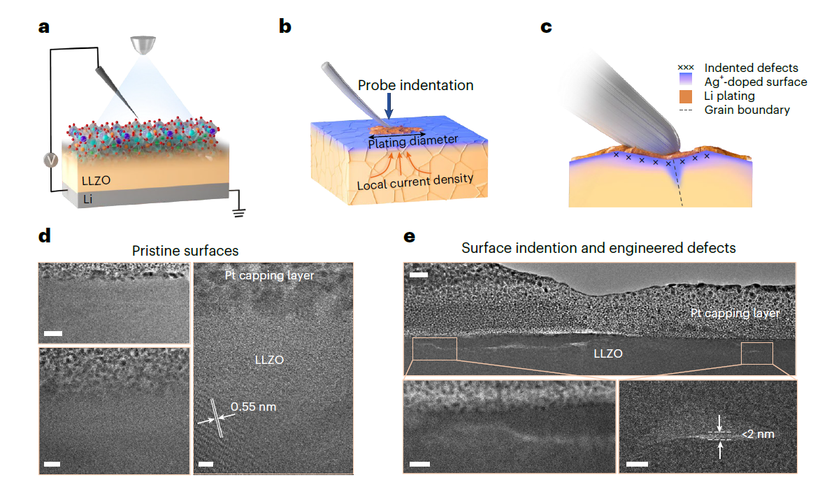 该团队报道了一种调控锂枝晶行为的新策略。研究表明,纳米尺度的非均匀掺杂可显著影响脆性固态电解质中锂枝晶的生长与侵入过程。这一基础研究为理解脆性固态电解质的失效机理提供了新的视角,也为其规模化生产和工程制造提供了重要的理论指导。