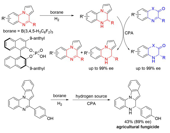 值得注意的是,这一串联过程为合成具有强效农用杀菌活性的对映体富集二氢吡咯并[1,2-a]喹喔啉衍生物提供了直接有效的方法。该研究融合了受阻路易斯酸碱对催化的氢化反应与手性磷酸催化的转移氢化反应,为同步合成两类结构各异的光学活性含氮杂环化合物提供了一种简便高效的策略。
