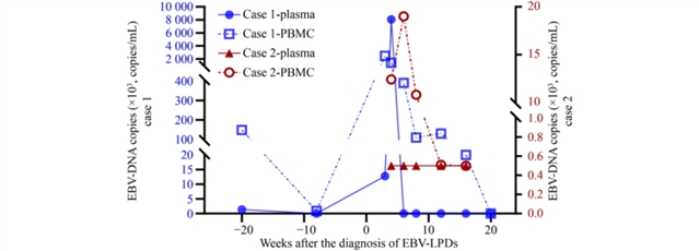 在治疗方面,除传统的B细胞清除药物外,免疫检查点抑制剂如PD-1/PD-L1阻断剂可通过恢复T细胞免疫功能、促进EB病毒清除,成为该背景下合理的治疗选择。本报告中两例患者对帕博利珠单抗或联合治疗均表现出良好反应,支持了这一策略的有效性。此外,血浆EB病毒-DNA作为疾病监测与疗效评估的生物标志物,在本研究两个病例发病前均呈现上升趋势,提示在CAR-T治疗后定期监测EB病毒载量,有助于早期识别此类并发症,尤其对于曾有EB病毒阳性淋巴瘤病史的患者更具临床意义。