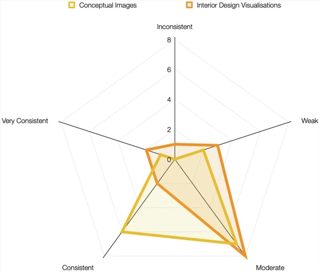 ▲ 图五:项目成果、初始概念设计图与人工智能融合室内效果图的一致性评估。©本文作者