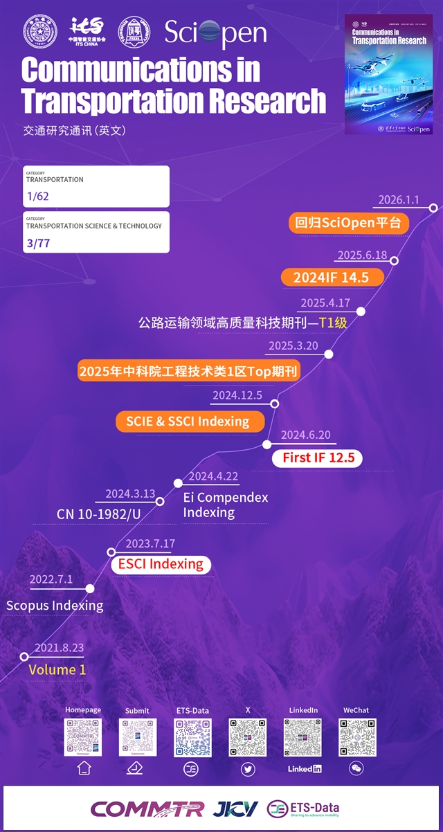 2026年初,由清华大学与中国智能交通协会共同主办的英文科技期刊《交通研究通讯(英文)》(Communications in Transportation Research,COMMTR)已全面回归至清华大学出版社自主研发的科技期刊国际化数字出版平台SciOpen,标志着该刊正式开启独立运营的新阶段。此次回归不仅是出版平台的升级,更是期刊坚守初心、深化服务全球交通学术共同体的重要举措。