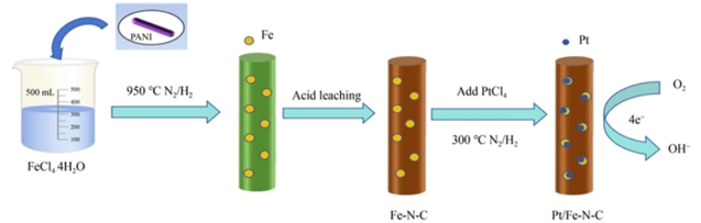 聚苯胺(PANI)因其导电性、结构可调性和易加工性,被广泛用作催化剂前驱体。其热解生成的碳基材料可有效分散金属活性位点,但如何通过结构设计增强金属-载体相互作用仍待突破。本研究提出通过PANI路径构建Fe-N-C载体,结合路易斯掺杂理论与自结构约束效应,优化Fe-N-C位点的分布与暴露,进而实现铂离子的均匀吸附与合金化。这一策略旨在通过电子结构与界面协同效应,同时降低铂负载量并提升催化性能,为低成本高效催化剂的开发提供新思路。