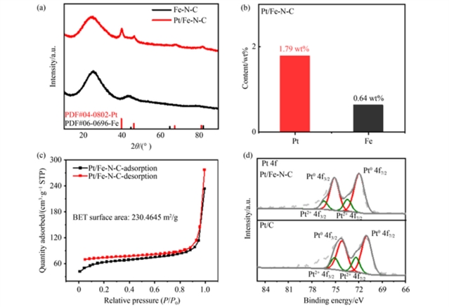 物理表征显示,Pt/Fe-N-C呈直径40–70 nm的纳米棒结构,铂颗粒均匀分散于载体表面,晶格间距0.222 nm对应Pt(111)晶面。X射线衍射(XRD)与X射线光电子能谱(XPS)分析表明,铂主要以零价态存在,且Pt 4f结合能较Pt/C正移1.0 eV,证实Fe向Pt的电子转移优化了表面电子结构。电感耦合等离子体(ICP)测试显示催化剂中Pt和Fe含量分别为1.79 wt%和0.64 wt%,比表面积及孔径分析(BET)表明其比表面积达230.46 m2/g,为活性位点暴露提供了充足的界面。
