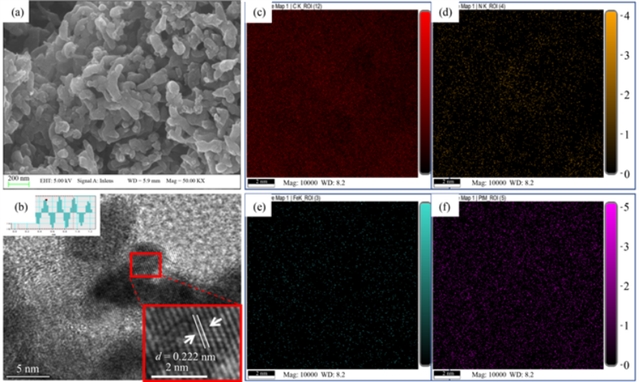 本研究首先通过无模板法合成了纳米棒状聚苯胺(PANI),并利用质子酸掺杂与氨水处理调控其氧化还原单元比例,形成可与过渡金属配位的EB-PANI。随后,将FeCl?·4H?O引入EB-PANI中,通过热解获得Fe-N-C载体。酸洗去除不稳定金属后,吸附PtCl4并在300 ℃下进行二次热还原,最终得到Pt-Fe双金属合金负载的Pt/Fe-N-C催化剂。