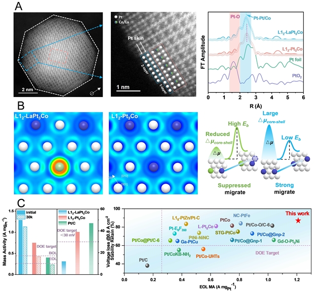 中国科学院长春应用化学研究所在低铂阴极催化剂的结构设计及其质子交换膜燃料电池应用方面取得重要进展。邢巍、肖梅玲、刘长鹏、刘伟研究团队围绕Pt-Co金属间化合物阴极催化剂在高电位循环下易发生组分迁移与溶出的痛点,提出化学键调控化学势桥接的新思路,构建了稀土镧(La)掺杂的有序L12-Pt3Co金属间化合物催化剂体系。相关研究成果以“Lanthanum-Induced Quasi-Covalent Bonding and Chemical Potential Bridging in Pt3Co Intermetallic Catalysts for Durable Fuel Cells”为题,发表于国际权威化学期刊《Journal of the American Chemical Society》。