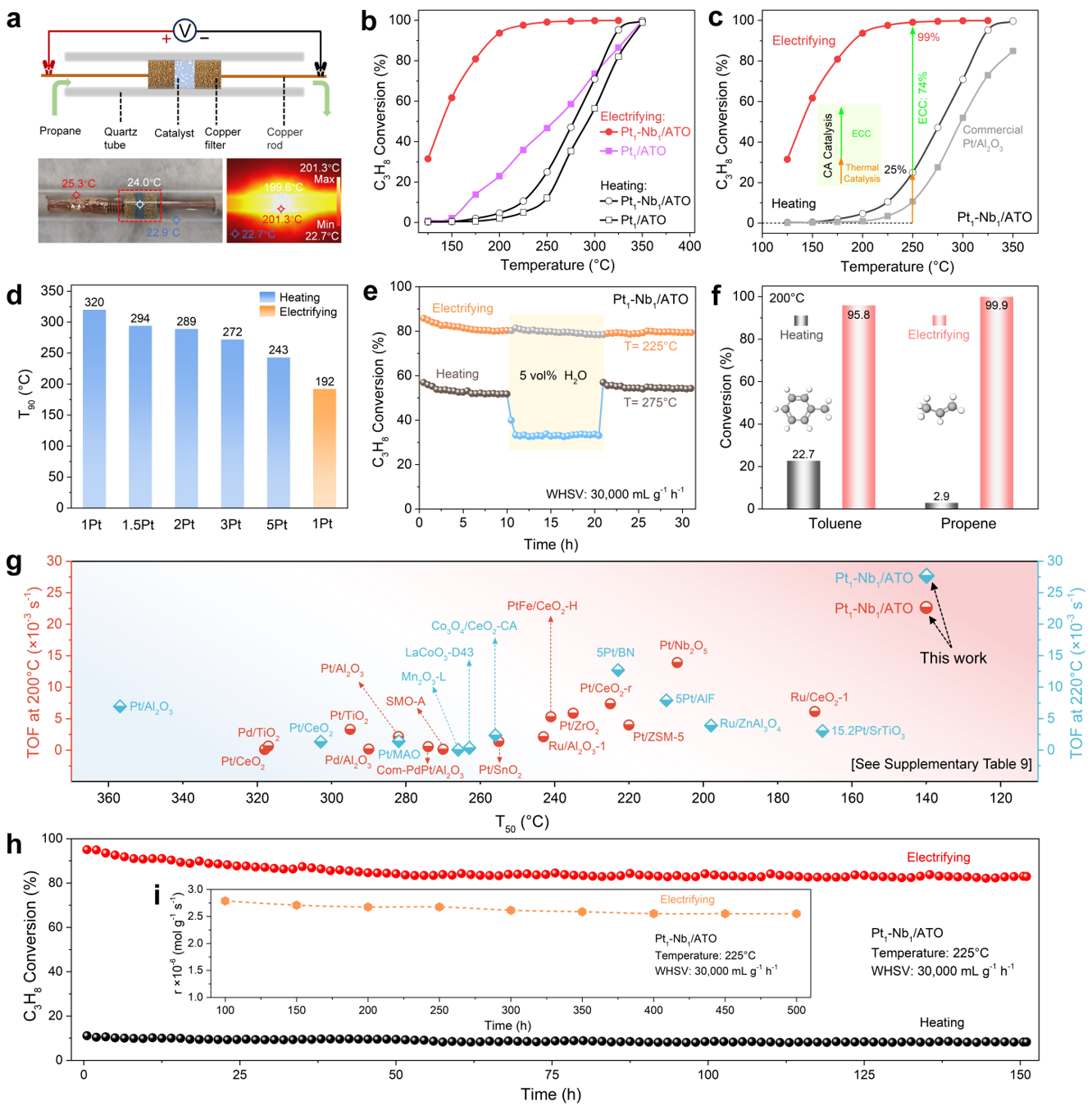 图2. 电流辅助策略下催化剂突破性的丙烷燃烧性能。(a) 电流辅助反应系统示意图;(b) 传统热催化与电流辅助催化活性对比;(c) 电流增强催化(ECC)效应的定量分解;(d) 不同Pt负载量催化剂的T90对比;(e) 抗水性能测试;(f) 对其他VOCs(甲苯、丙烯)的催化活性;(g) 与已报道催化剂的性能比较;(h, i) 长期稳定性测试。