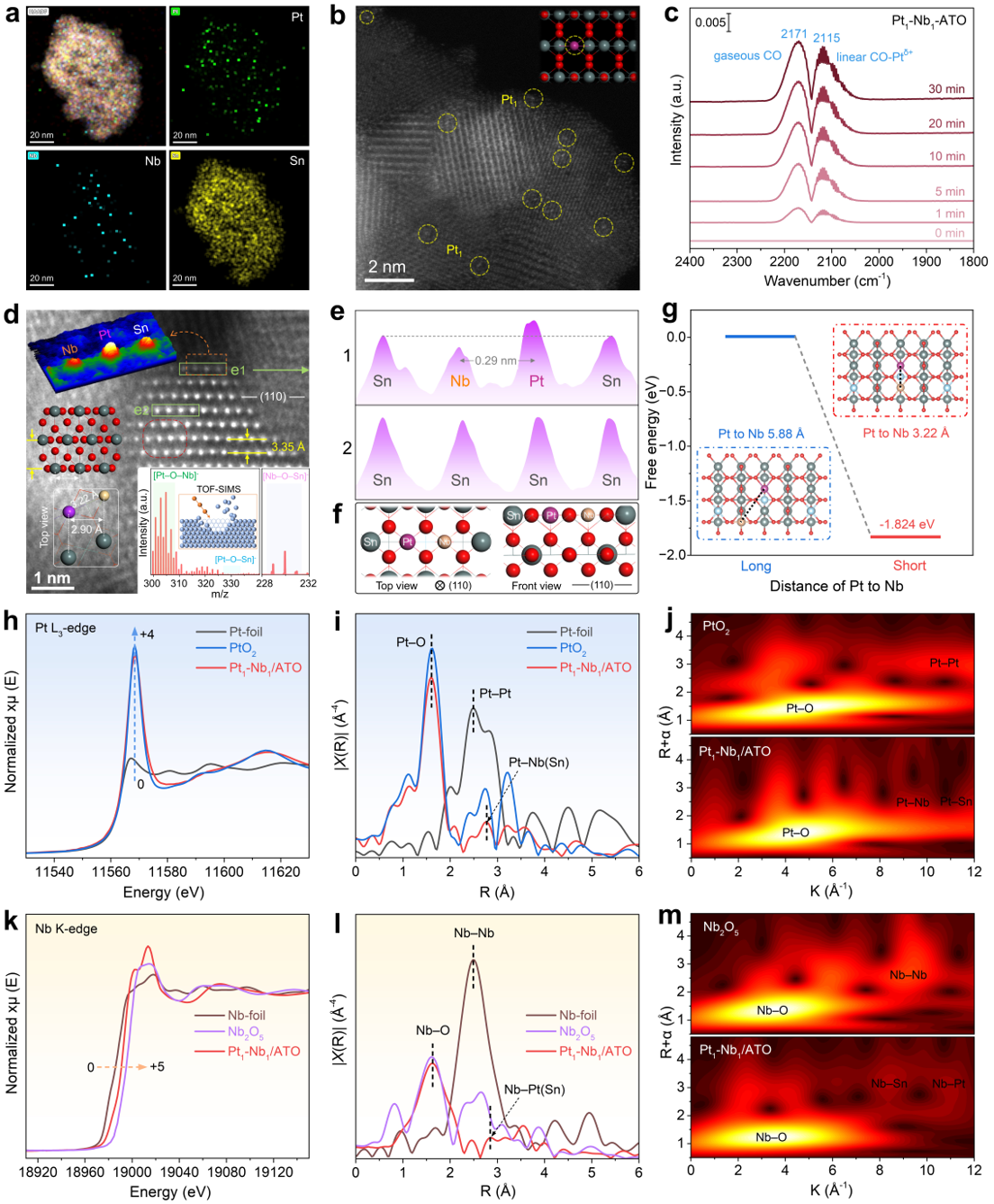 图1. Pt-Nb/ATO双原子催化剂的精细结构与位点状态分析。(a, b) HAADF-STEM图像与EDS元素分布图;(c) 原位CO-DRIFTS光谱;(d)原子级物相与局域结构图;(e) Z-衬度强度曲线;(f) Pt1-Nb1位点原子模型;(g) 形成能DFT计算;(h-j) Pt L3边XAS谱图;(k-m) Nb K边XAS谱图。