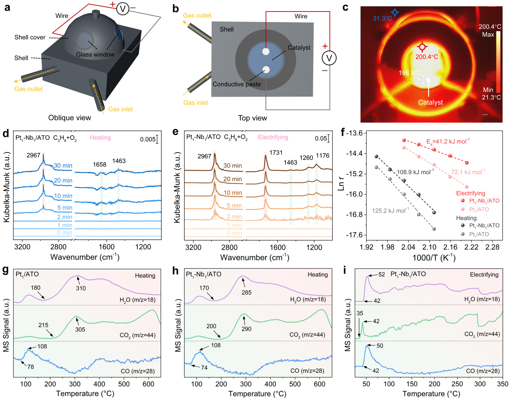 图4. 电流辅助策略在催化过程中的作用:反应路径与动力学解析。(a-c) 电流辅助原位DRIFTS装置与实验条件;(d, e) 原位DRIFTS谱图对比;(f) Arrhenius动力学曲线;(g-i) C3H8-TPSR谱图对比。