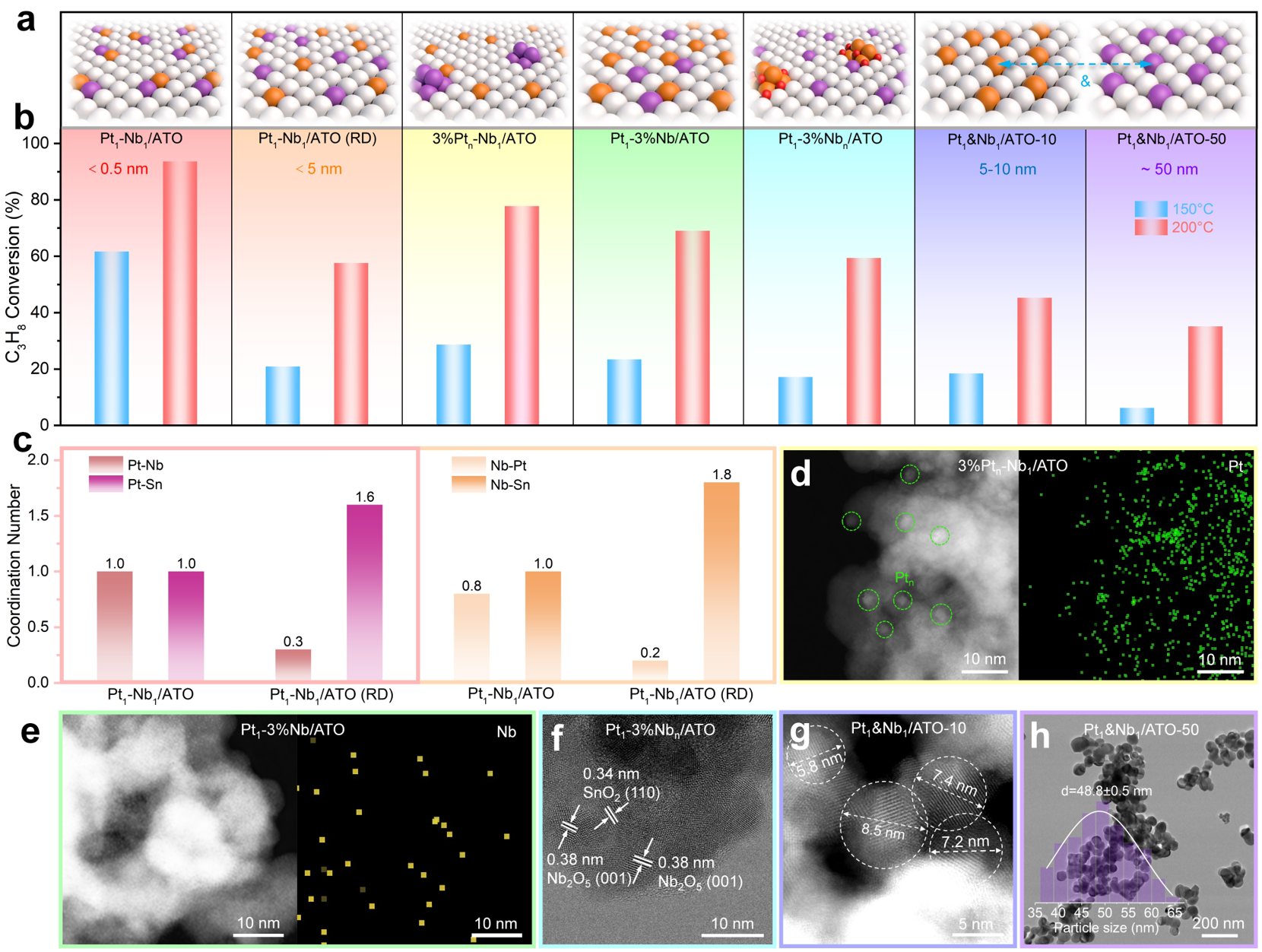 图3. 活性位点构型对电流辅助催化性能的影响。(a) 不同催化剂位点状态示意图;(b) 不同构型催化剂的电流辅助催化活性;(c) EXAFS配位数对比;(d) 3%Ptn-Nb1/ATO的HAADF-STEM图;(e) Pt1-3%Nb/ATO的HAADF-STEM图;(f) Pt1-3%Nbn/ATO的HAADF-STEM图;(g, h) Pt1&Nb1/ATO-10/50的HAADF-STEM图。