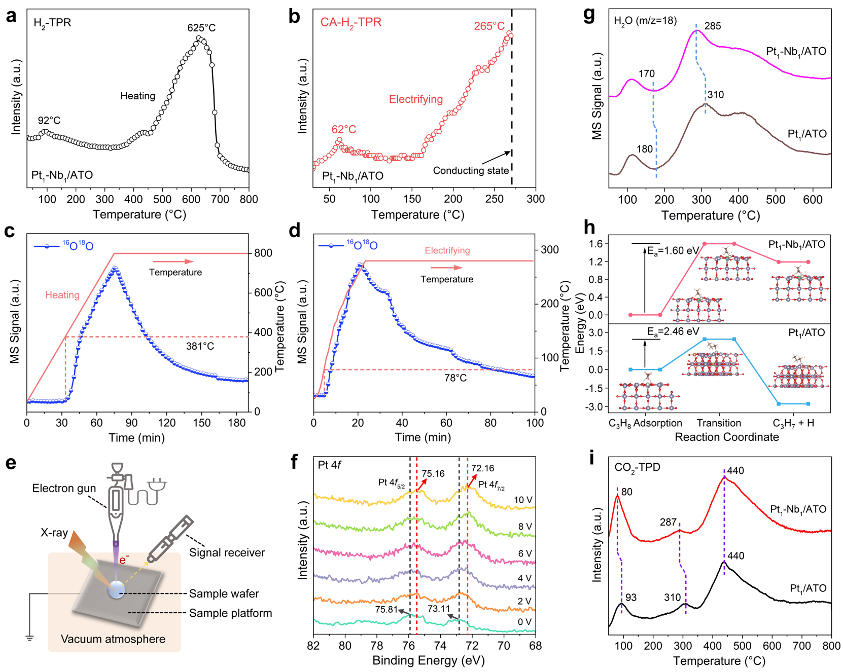 图5. 电流辅助下Pt1和Nb1位点的微观作用机制。(a, b) H2-TPR谱图对比;(c, d) 同位素氧交换(IOE)测试;(e) 原位XPS装置示意图;(f) 电流辅助原位XPS谱图;(g) C3H8-TPSR中的H2O信号;(h) DFT计算的C-H键解离能垒;(i) CO2-TPD谱图。