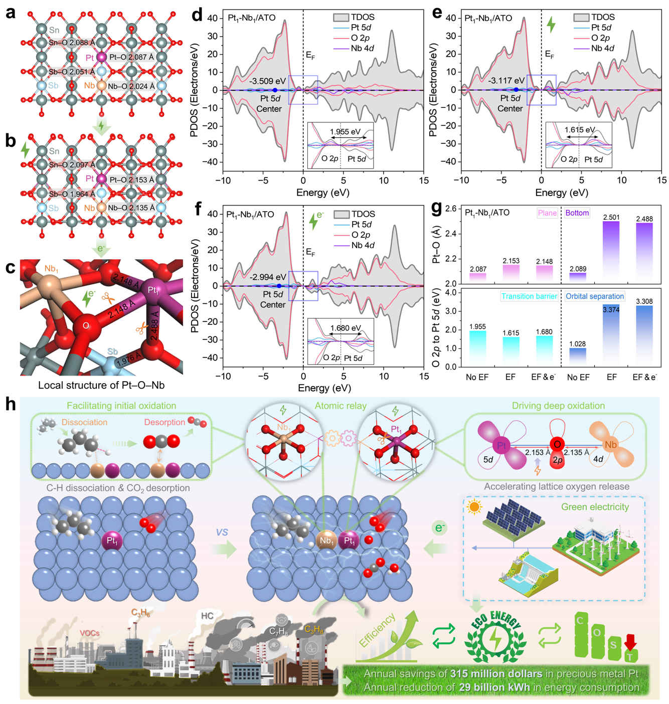 图6. DFT计算揭示电子结构变化及协同电流辅助-原子接力催化机理模型。(a-c) 不同条件下Pt1-Nb1位点的优化结构模型;(d-f)相应的投影电子态密度图;(g) Pt-O键长与能带结构参数;(h)电流辅助原子接力催化机制示意图与应用展望。