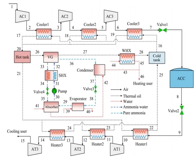 CAES-CCHP系统通常回收多级压缩过程的压缩热用于供热,同时利用膨胀后的低温空气实现供冷,其RTE在23%-68%之间,TEE可达65%-155%。集成吸收式热泵(AHP)的混合系统可进一步提升性能。例如,CAES-AHP系统的供热能力与RTE分别提高了44%和16%。然而,CAES对地下储气空间的依赖限制了其地理适用范围。