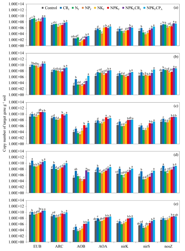 图3 土壤中总细菌 (EUB)、总古菌 (ARC)、硝化微生物 (AOB和AOA) 及反硝化微生物 (nirK、nirS和nosZ基因) 的丰度。(a) 2021季木薯生产前,(b) 2021季木薯生产中,(c) 2021季木薯生产后,(d) 2022季木薯生产中,以及 (e) 2022季木薯生产后。
