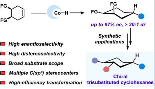 近日,西北工业大学荣子强团队报道了钴催化对映选择性脱对称氢烷基化模块化合成手性多取代环己烷。2026年1月5日,《美国化学会志》发表了这一成果。