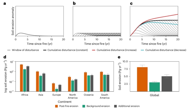 研究组基于过去二十年间野火发生和火势严重程度的全球数据库,以及修订通用土壤流失方程(RUSLE)模型,并结合遥感数据对受烧毁地表的恢复情况,对火后土壤侵蚀进行了全球评估。他们利用全球野火发生和火势严重程度数据库以及修订通用土壤流失方程(RUSLE)模型,结合遥感数据对受烧毁地表的恢复情况,对火后土壤侵蚀的全球趋势进行了估算。