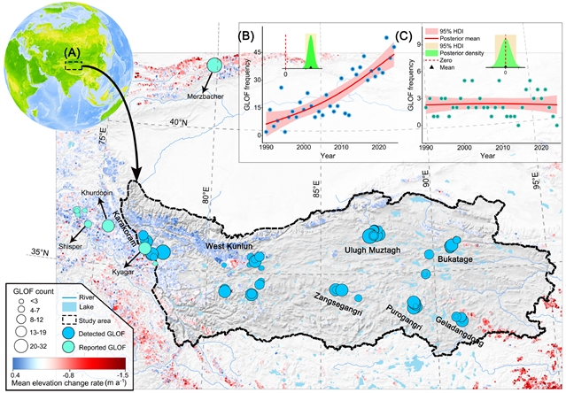 贝叶斯回归分析显示,GLOF频率急剧上升,从1990-1994年期间的平均每年11起增加到2020-2024年期间的每年42.6起。同时,与1990年相比,GLOF发生时间提前了9.07±3.71天,且排水前的湖泊面积减少了0.02±0.01平方公里。这些发现凸显了冰坝湖在气候变化和冰川退缩背景下的演变行为,对区域冰冻圈研究和减灾工作具有重要意义。