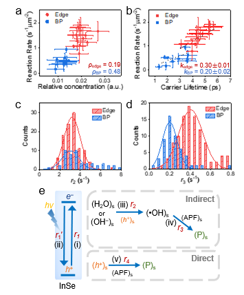 研究发现,InSe的边缘和褶皱处表现出比基面更长的载流子寿命和更高的光催化活性,这主要源于缺陷结构作为载流子陷阱,有效抑制了电子-空穴对的复合,并为表面反应提供了更多的活性位点。