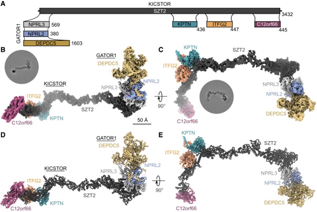 Abstract: The guanosine triphosphate (GTP)-bound state of the heterodimeric Rag GTPases functions as a molecular switch regulating mechanistic target of rapamycin complex 1 (mTORC1) activation at the lysosome downstream of amino acid fluctuations. Under low amino acid conditions, GTPase-activating protein (GAP) activity toward Rags 1 (GATOR1) promotes RagA GTP hydrolysis, preventing mTORC1 activation. KICSTOR recruits and regulates GATOR1 at the lysosome by undefined mechanisms. Here, we resolve the KICSTOR-GATOR1 structure, revealing a striking ~60-nm crescent-shaped assembly. GATOR1 anchors to KICSTOR via an extensive interface, and mutations that disrupt this interaction impair mTORC1 regulation. The S-adenosylmethionine sensor SAMTOR binds KICSTOR in a manner incompatible with metabolite binding, providing structural insight into methionine sensing via SAMTOR-KICSTOR association. We discover that KICSTOR and GATOR1 form a dimeric supercomplex. This assembly restricts GATOR1 to an orientation that favors the low-affinity active GAP mode of Rag GTPase engagement while sterically restricting access to the high-affinity inhibitory mode, consistent with a model of an active lysosomal GATOR1 docking complex.