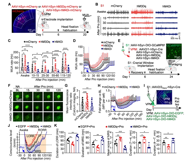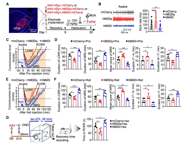 既往研究发现,丘脑VPM核团与初级体感皮层(primary somatosensory cortex, S1)之间存在明确的神经投射。研究者通过化学遗传学技术,结合在体电生理记录和双光子钙成像技术发现,激活VPM神经元可显著减轻丙泊酚对S1神经元活性的抑制,并加速小鼠意识恢复,反之亦然。为进一步探究VPM→S1通路在麻醉意识复苏中的作用,研究人员特异性操控投射至S1的VPM神经元,发现激活这群神经元可显著加速麻醉恢复;抑制这群神经元则延迟麻醉恢复。值得注意的是,操控其他投射至S1的丘脑核团均未对麻醉苏醒产生影响,凸显了VPM→S1通路在麻醉觉醒中的特异性作用(图3)。