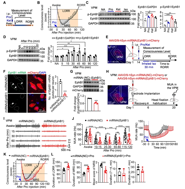 研究者特异性敲低投射至S1Glu神经元的VPMGlu神经元中EphB1受体后,发现其可以显著增强丙泊酚对VPM-S1环路的电活动抑制,并显著延迟麻醉意识复苏,证明EphB1通过兴奋VPM→S1谷氨酸能通路促进麻醉意识复苏(图5)。