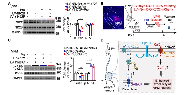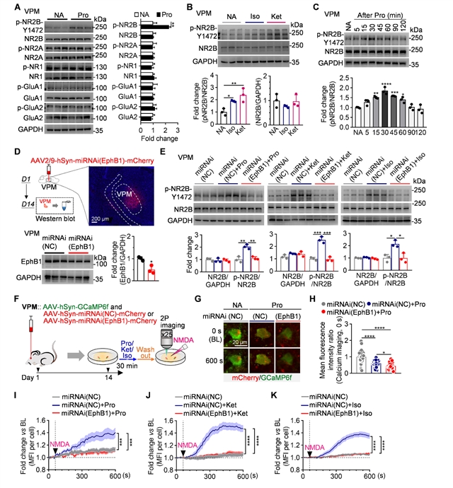 在确定环路后,研究者进一步寻找EphB1影响麻醉恢复的分子机制。发现在MRS状态下VPM中的NMDA受体的NR2B亚基(Y1472位点)磷酸化水平显著升高。特异性敲低EphB1则可完全逆转NR2B-Y1472位点的磷酸化,同时抑制麻醉药诱导的NMDA受体介导的钙离子内流增强。这表明VPM中EphB1-NR2B通路激活是麻醉后意识复苏的重要环节(图6)。