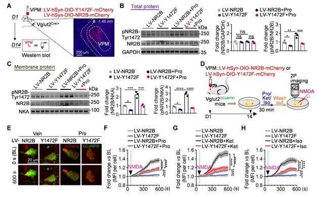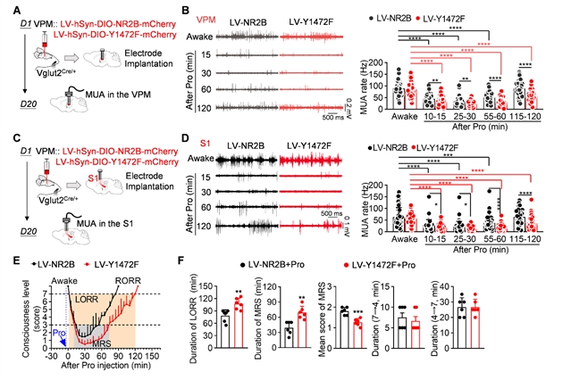 研究通过特异性过表达NR2B(Y1472F)突变体,抑制了VPM神经元NR2B酪氨酸磷酸化。过表达突变NR2B后,不仅减少了NMDA受体在VPM神经元细胞膜上的表达,还完全逆转了麻醉药诱导的NMDAR介导的钙内流增强,增强丙泊酚对VPM-S1神经环路的电活动抑制,延迟麻醉意识复苏。这充分证明,NR2B Y1472位点的磷酸化是驱动麻醉苏醒的关键分子事件(图7-8)。