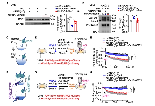 此外,EphB1作为受体酪氨酸激酶,在麻醉状态下,EphB1的激活不仅可以通过磷酸化NMDA受体调控神经元兴奋性,还参与调控氯离子共转运蛋白KCC2的泛素化降解。特异性敲低EphB1可有效阻止丙泊酚引起的KCC2泛素化增加及KCC2降解,并逆转丙泊酚对KCC2氯离子转运功能的抑制,从而维持GABAAR激活介导的正常氯离子内流。这表明VPM中EphB1-KCC2通路是麻醉后意识复苏的重要环节(图9)。