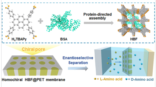 Abstract: Homochiral nanochannel membranes hold promise for scalable enantiomer separation, yet achieving high enantioselectivity with robust flux remains challenging due to structural instability and heterogeneous active sites. Here, we report for the first time a voltage-driven in situ assembly strategy to construct a homochiral hydrogen-bonded biohybrid framework (HBF) within poly(ethylene terephthalate) (PET) nanochannels (HBF@PET). Leveraging directional hydrogen bonding between bovine serum albumin and 1,3,6,8-tetra (terephthalic acid) pyrene (H4TBAPy), the membrane inherits BSA’s chiral microenvironment while achieving exceptional structural stability. The HBF@PET membrane enables near-complete resolution of racemic histidine (ee >99%) with d-His preferentially transported at a record flux of 4.52 ± 0.04 mmol m–2 h–1, surpassing state-of-the-art nanochannel systems. Mechanistic studies reveal stronger binding affinity of HBF for l-His, hindering its diffusion while facilitating d-His permeation. The membrane further demonstrates broad applicability to tryptophan and arginine enantiomers. This work pioneers the development of protein-guided hydrogen-bonded frameworks within nanochannels, offering a scalable platform for high-efficiency chiral separations in pharmaceuticals.