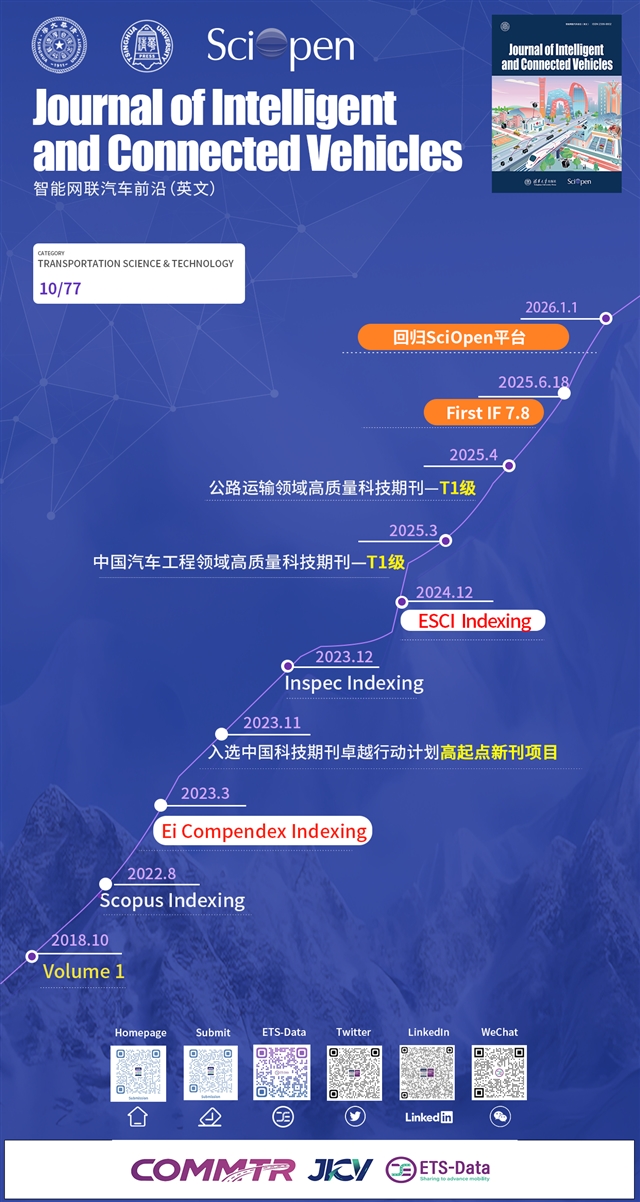 回归自主平台是JICV积极参与全球科技治理、推动学科前沿发展的重要举措。期刊将依托SciOpen的智能化出版与国际传播体系,进一步促进智能网联汽车领域学术交流与产业对接,加速创新成果向现实生产力转化,助力全球智能出行生态构建。