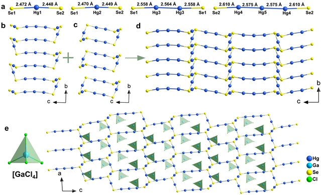 中国科学院新疆理化技术研究所首次在Hg基硫卤化物体系中构筑了线性[Hg3Se2]多核簇结构单元。该单元沿特定晶向高度有序排列,形成类鳞英石拓扑骨架。不同于传统四面体或链状硫属化物结构,该线性簇在晶体中表现出显著的取向一致性,为实现强光学各向异性提供了全新的结构设计思路。