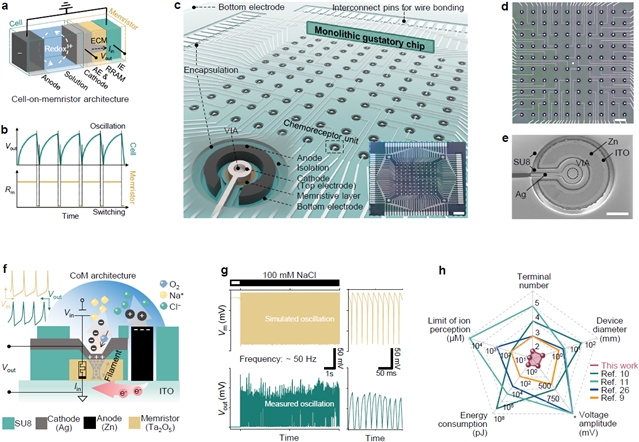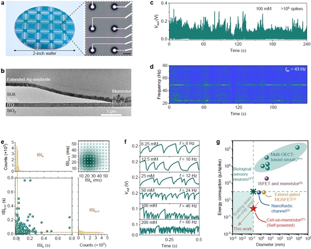 基于CMOS兼容制造工艺,实现了CoM器件的晶圆级阵列制备,演示了该领域中首个高密度化学感受器阵列系统。阵列中的单器件可以在盐水溶液的离子刺激下,自发、原位地产生电压振荡信号,其振荡频率与离子浓度直接相关。性能表征测试表明,阵列上的CoM器件表现出包括亚阈值振荡、非周期性簇状放电、全有或无尖峰脉冲以及随机振荡等高阶神经元动力学行为。