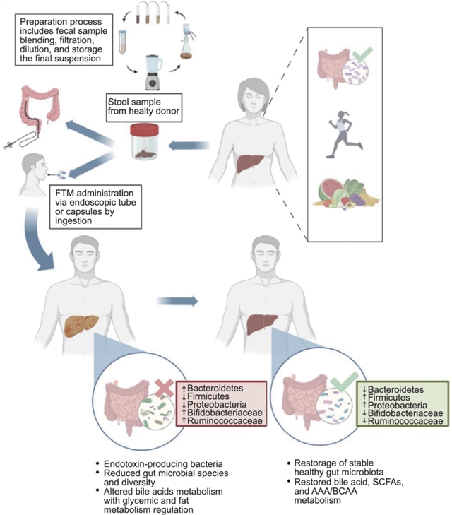 图1 FMT过程示意图。选取健康的捐献者作为粪便移植的供体,捐献者往往具有优势的微生物群和良好的生活习惯。粪便采集后进行预处理,为随后的给药做好准备,给药可通过内窥镜检查或胶囊方式进行。目标人群是确诊患有MASLD并同时伴有菌群失调的患者。预期结果是在受者体内建立更健康的微生物群,同时减缓MASLD的发展。AAA:芳香族氨基酸;BCAA:支链氨基酸。