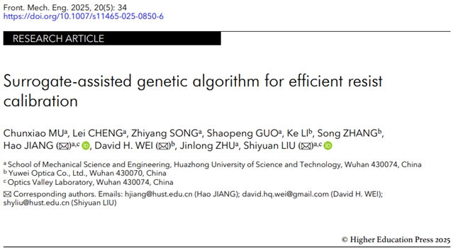 发表于《Frontiers of Mechanical Engineering》(现已更名为《ENGINEERING Mechanical Engineering》)2025年第20卷第5期的研究论文《Surrogate-assisted genetic algorithm for efficient resist calibration》,提出一种代理辅助遗传算法(SAGA),通过融合基于克里金插值的代理模型与动态自适应机制,实现光刻胶模型系数、卷积核参数及空间像参数的联合优化,有效突破传统技术瓶颈。