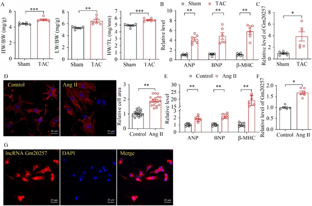 研究团队首先在体内外心肌肥厚模型中检测了Gm20257的表达情况。在体内,通过对C57BL/6J小鼠进行主动脉缩窄手术建立压力超负荷心肌肥厚模型,4周后发现心肌组织中Gm20257的表达显著增加;在体外,用血管紧张素II处理新生小鼠心室肌细胞48小时诱导心肌细胞肥厚,同样观察到Gm20257的表达上调。荧光原位杂交实验显示,Gm20257主要定位在细胞质中(图1)。