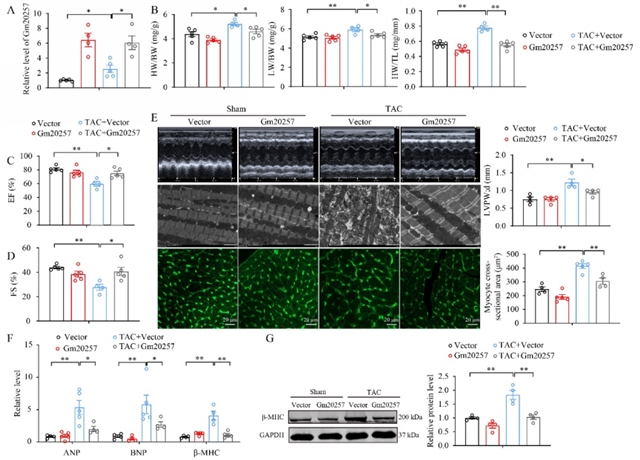 为研究Gm20257对心肌肥厚的影响,研究团队进行了功能获得和功能缺失实验。在体外细胞实验中,使用小干扰RNA抑制Gm20257的表达后,心肌细胞的横截面积增加了约1.5倍,心肌肥厚标志物心房钠尿肽、脑钠肽和β-肌球蛋白重链的mRNA和蛋白水平显著升高;而通过质粒转染过表达Gm20257则能有效减轻血管紧张素II诱导的心肌细胞横截面积增大,降低上述肥厚标志物的表达(图2)。在体内动物实验中,通过腺相关病毒9载体在小鼠体内过表达Gm20257,发现其能减轻主动脉缩窄手术引起的心脏重量与体重比、肺重量与体重比等心脏肥厚指标的异常,改善心脏收缩功能,如提高左心室射血分数和缩短分数,减少心肌细胞横截面积的增大(图3)。透射电子显微镜观察显示,过表达Gm20257还能减轻主动脉缩窄手术导致的心肌纤维溶解和线粒体结构紊乱。