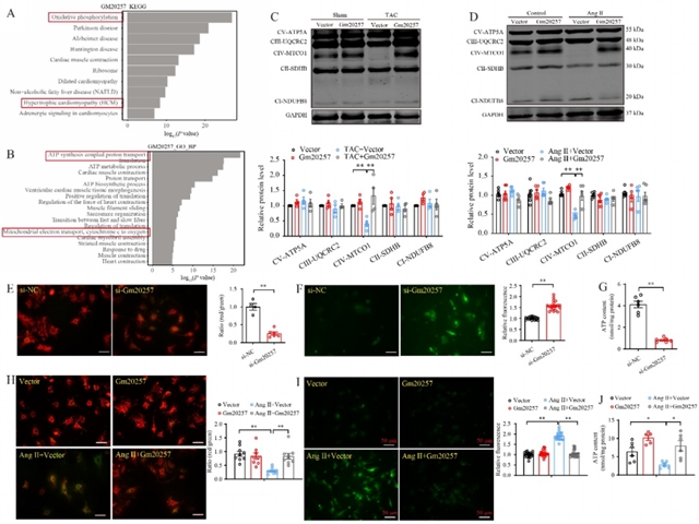 进一步研究发现,Gm20257对心肌肥厚的调控与线粒体功能有关。在主动脉缩窄模型和血管紧张素II处理的心肌细胞中,线粒体呼吸链复合物IV的表达均显著降低,而过表达Gm20257能逆转这种降低(图4)。功能实验表明,抑制Gm20257会导致线粒体膜电位去极化、活性氧产生增加和三磷酸腺苷含量减少;相反,过表达Gm20257能改善血管紧张素II引起的线粒体膜电位降低、活性氧增多和三磷酸腺苷合成受抑制的情况。