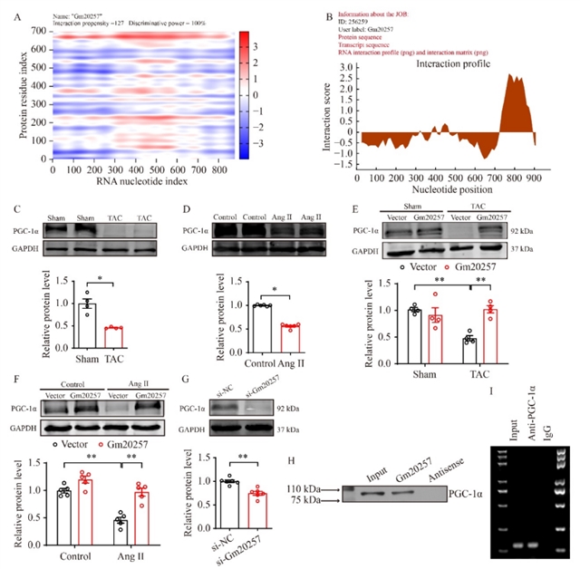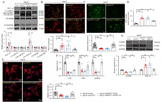 为探究Gm20257调控线粒体功能的分子机制,研究团队通过生物信息学预测发现Gm20257与过氧化物酶体增殖物激活受体γ辅激活因子1α具有较高的结合分数。Western blot实验显示,在心肌肥厚模型中过氧化物酶体增殖物激活受体γ辅激活因子1α的表达降低,而过表达Gm20257能上调其表达,抑制Gm20257则会进一步降低其表达。RNA免疫沉淀和RNA pull-down实验证实,Gm20257与过氧化物酶体增殖物激活受体γ辅激活因子1α存在直接相互作用(图5)。此外,通过小干扰RNA抑制过氧化物酶体增殖物激活受体γ辅激活因子1α的表达,能够逆转Gm20257对线粒体复合物IV表达、线粒体膜电位、活性氧水平、三磷酸腺苷含量以及心肌肥厚标志物的改善作用(图6)。