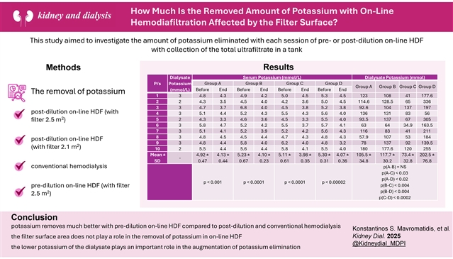 MDPI引用格式:Mavromatidis, K.S.; Kalogiannidou, I.M.; Katzel Achmet, G.S. How Much Is the Removed Amount of Potassium with On-Line Hemodiafiltration Affected by the Filter Surface? Kidney Dial. 2025, 5, 6.