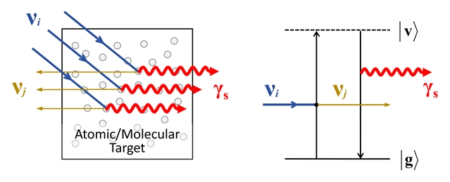 图:宇宙背景中微子与原子或分子系统的相干散射诱导后者产生参量荧光效应,其中|v⟩和|g⟩分别表示分子激发和基态能级。