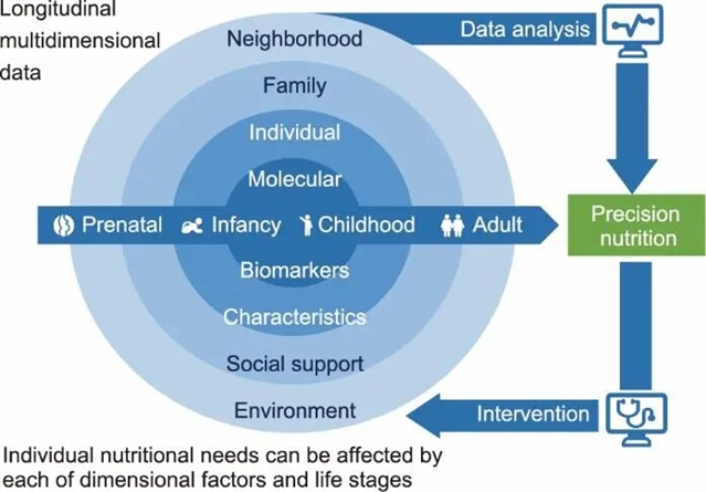 推进精准营养的最大挑战在于生成坚实且公正的科学证据,为临床实践、公共卫生政策及膳食建议提供指导。如图1所示,个体营养需求既受“细胞至社会”多维因素影响,又随“胎儿期至成年期”各生命阶段动态变化。传统营养学研究侧重于单一营养素,忽视复合暴露。未来研究需从单一营养素视角转向分子、个人、家庭、社区及社会层面的多维度因素整合。因此,精准营养的突破有赖于纵向追踪与多维度数据采集。典型范例之一是美国全民健康研究计划(All of Us),该计划纳入百万人口,是实施多维度数据采集的全国性纵向队列研究[12]。