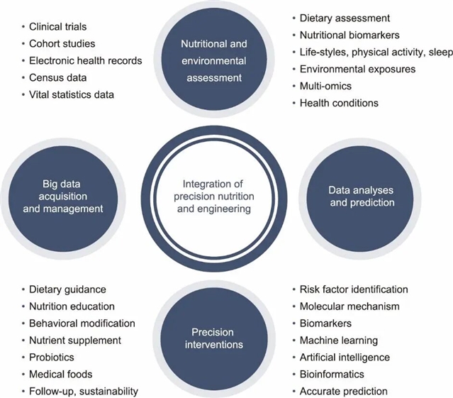 传统营养补充剂的应用通常采用“一刀切”的方式,但由于缺乏对个体差异(如遗传背景、健康状况、生活方式及饮食摄入等因素)的考量,存在一定局限性。由于个体差异,完全相同的营养补充方案可能会对身体产生益处,也可能完全没有效果甚至对身体有害。精准营养学应运而生,该学科旨在通过精准评估个体的营养与健康需求,制定个性化膳食及营养补充方案。工程学可在精准营养学研究和转化的各环节发挥关键作用,包括大数据采集与管理、营养与环境评估、数据分析、预测、生物医学工程及营养工程等方面。二者的深度融合将提升我们服务全人类营养健康需求的能力。