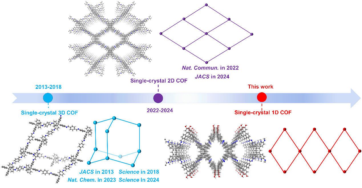 过去二十年间,共价有机框架(COFs)作为一类新兴晶态多孔材料,凭借共价键连接的稳定骨架与可精准调控的孔道结构,在吸附分离、传感检测、催化反应、生物医学等领域展现出巨大应用潜力。依据结构维度,COFs可划分为一维、二维与三维体系。其中,二维与三维COFs在单晶制备及结构解析方面已取得长足进展,而一维COFs的单晶制备与结构解析尚未报道。这可以归因于一维COFs的独特性质:其一,一维COFs链间相互作用显著弱于二维、三维COFs,各向异性生长动力学与长程有序性不足,使得高质量单晶难以获得;其二,受限于缺乏高质量单晶样品,一维COFs的结构长期停留在计算机模拟阶段,无法精准揭示链间作用、层间堆积模式、层间距等关键结构信息,严重阻碍了结构—性能关联机制的深入阐释与材料的定向设计。因此,发展普适性的一维COFs单晶合成与调控策略,并实现原子级精准结构解析,已成为该领域亟待攻克的挑战。