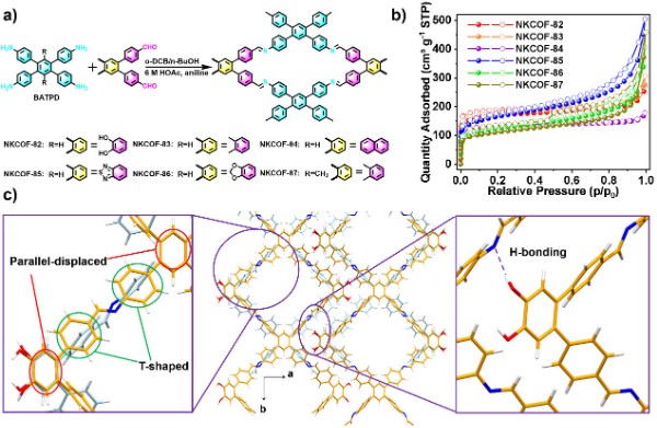 图2:NKCOF-82的合成与表征。a) NKCOFs的合成路线;b) NKCOFs的氮气吸附-脱附等温线;c) NKCOF-82的晶体结构。