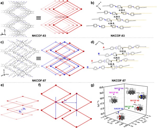 图5:a) NKCOF-83的堆积结构;b) NKCOF-83的层间距;c) NKCOF-87的堆积结构;d) NKCOF-87的层间距;e) 层间距(D1)与层间滑移距离(D2)示意图;f) 链间间距(L1)示意图;g) NKCOF-82-86的层间距(D1)、层间滑移距离(D2)及链间间距(L1)。