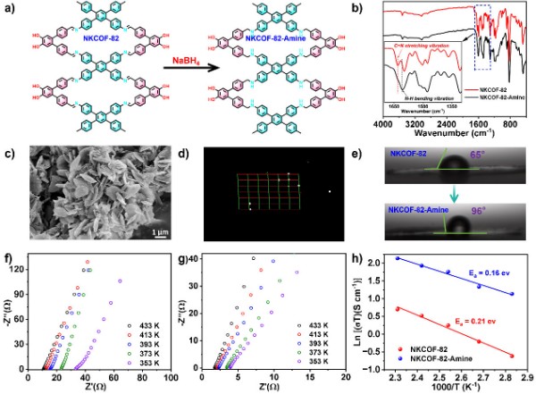 图6:a) NKCOF-82还原为NKCOF-82-Amine的示意图;b) NKCOF-82-Amine与NKCOF-82的红外光谱图;c) NKCOF-82-Amine的扫描电镜图;d) NKCOF-82-Amine的三维倒易点阵;e) NKCOF-82与NKCOF-82-Amine的接触角;f) 不同温度下H3PO4@NKCOF-82的奈奎斯特图;g) 不同温度下H3PO4@NKCOF-82-Amine的奈奎斯特图;h) H3PO4@NKCOF-82与H3PO4@NKCOF-82-Amine的阿伦尼乌斯图。