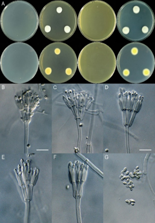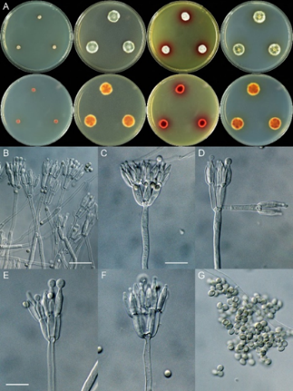 图5. 亚洲象篮状菌(Talaromyces elephas)菌落形态与微观形态特征。