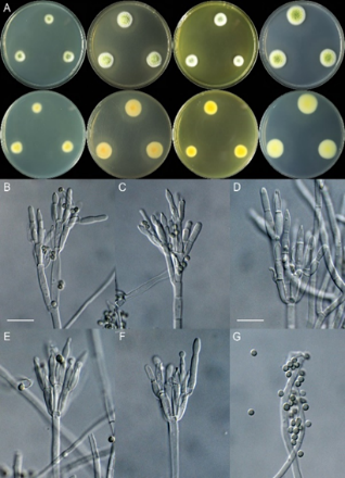 图4. 天山篮状菌(Talaromyces tianshanicus)菌落形态与微观形态特征。